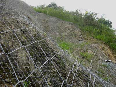 主動邊坡防護網是有鋼絲繩、環形網、需要攔截小塊落實是附加一層鐵絲格柵、固定系統(包括錨桿。攔錨繩、基座、支撐繩)、減壓環和鋼柱組成,鋼柱和鋼絲繩網鏈接在一起構成一個整體,對所要防護的區域形成大面積的防護,因為邊坡防護網的應用,阻止崩塌巖石土體下墜,能起到邊坡防護的作用。