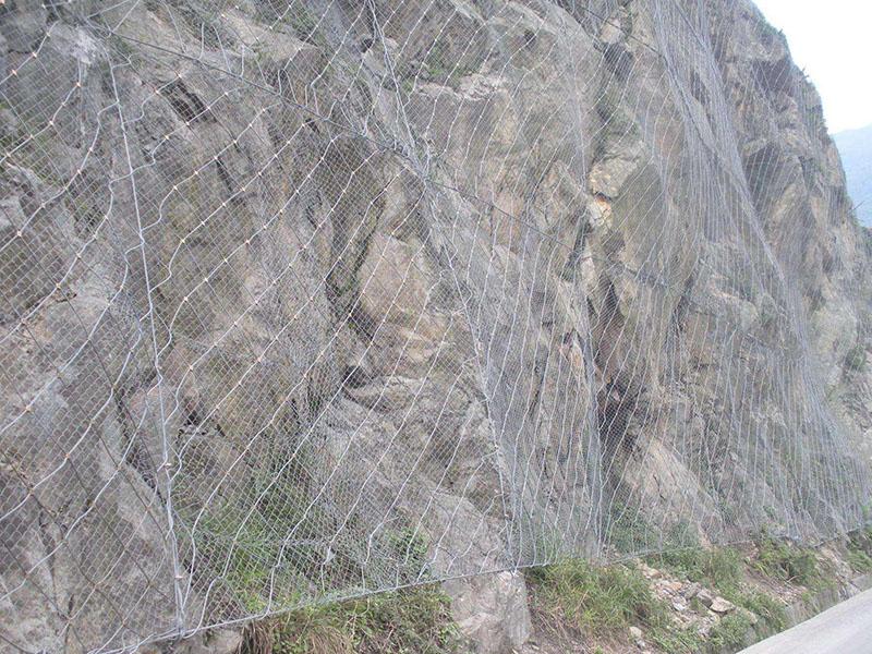 GAR2型主動防護(hù)網(wǎng)是采用Φ8的鋼絲繩(抗拉強(qiáng)度為1770Mpa,破斷拉力>40KN)編制并在結(jié)點(diǎn)處用專用“十字扣”固定而成,為邊坡防護(hù)網(wǎng)的主要特征構(gòu)件之一,在主動防護(hù)中通過鋼絲繩網(wǎng)的覆蓋來實(shí)現(xiàn)邊坡的加固,其開放特征可以實(shí)現(xiàn)對坡面天然植被和植被生長條件的最佳保護(hù),實(shí)現(xiàn)環(huán)境保護(hù)與災(zāi)害治理的有機(jī)結(jié)合;在被動防護(hù)系統(tǒng)中,其柔性特征充分體現(xiàn)了“以柔克剛”的思想,實(shí)現(xiàn)崩塌落石的有效攔截。